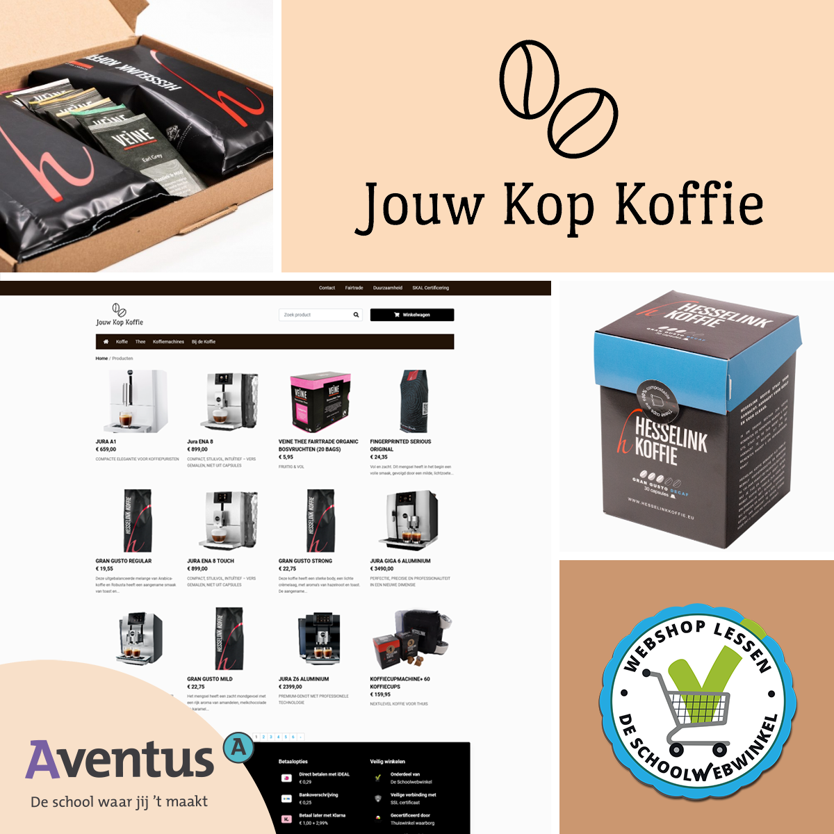 MBO studenten Thiemo Wessels, Dries Hoffman, Daan Kalksma, Joran de Groot en Thieme Willemsen steunen de lokale ondernemer Hesselink Koffie uit Winterswijk door een webshop te maken voor hun opleiding Ondernemer-Retail-Ecommerce van Aventus in Apeldoorn.